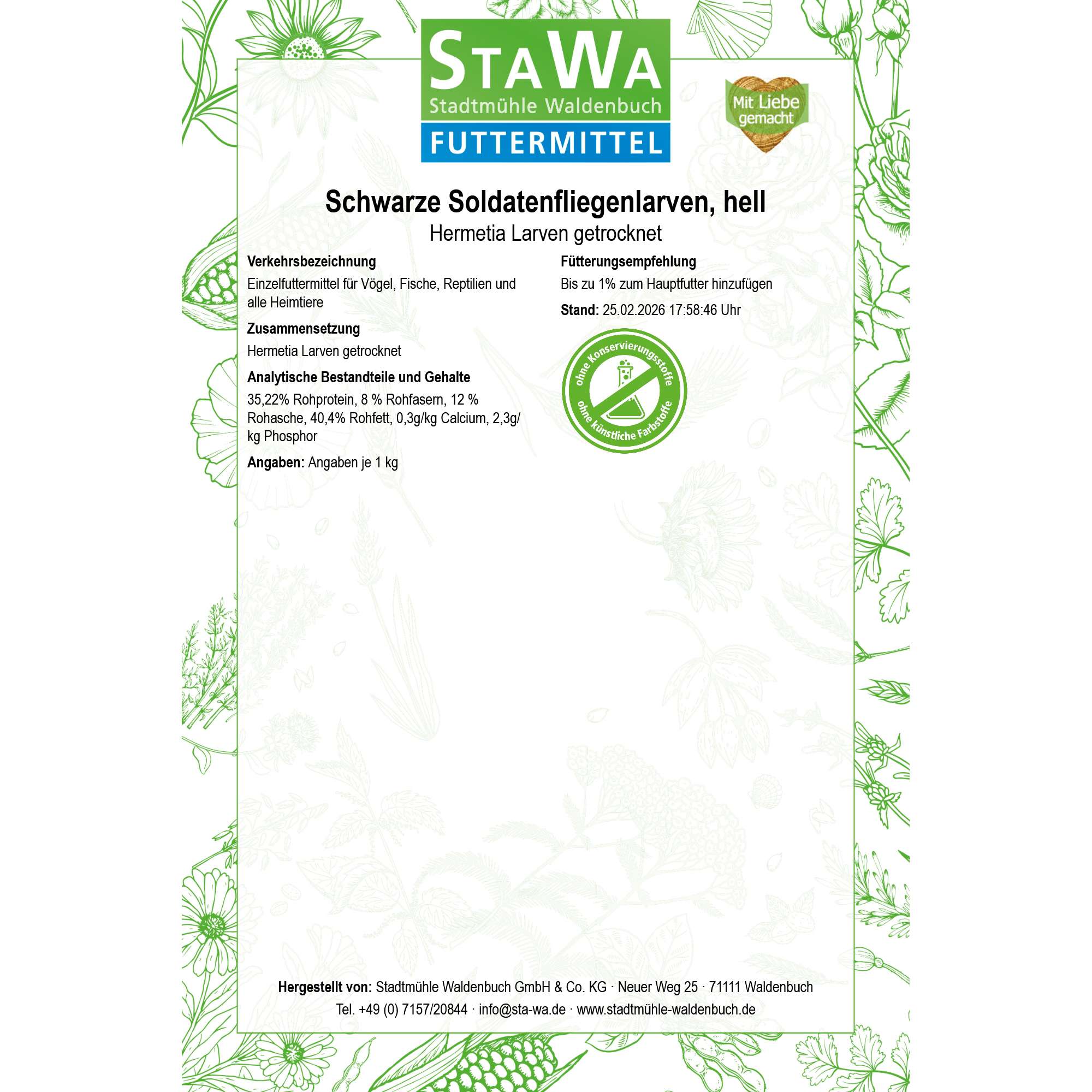 | Verkehrsbezeichnung | Einzelfuttermittel für Vögel, Fische, Reptilien und alle Heimtiere |