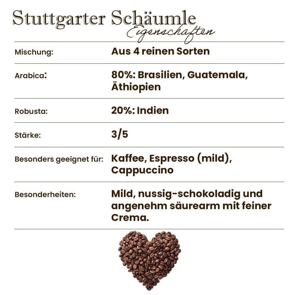 Das Stuttgarter Schäumle ist ein milder Kaffee mit geringer Säure, der den Magen schont und dennoch mit einem ausgewogenen, aromatischen Geschmack überzeugt. Genau diese Balance macht ihn zum All-Rounder unter unseren Kaffees – ideal für alle, die es gerne etwas sanfter mögen, ohne auf Genuss zu verzichten.