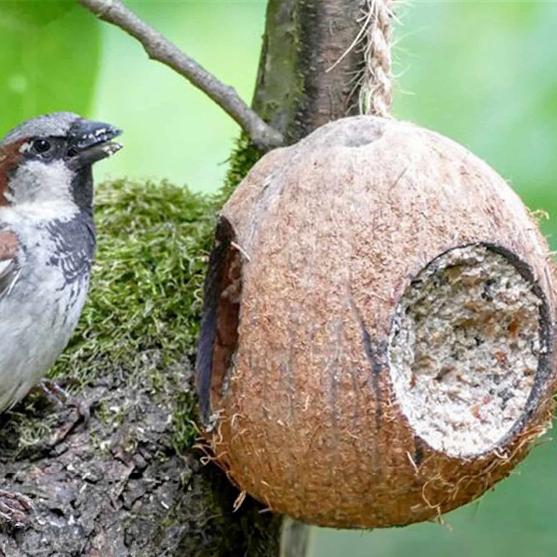 Dank des integrierten Bandes lässt sich die Kokosnuss einfach aufhängen und wird schnell zum beliebten Treffpunkt am Futterplatz.