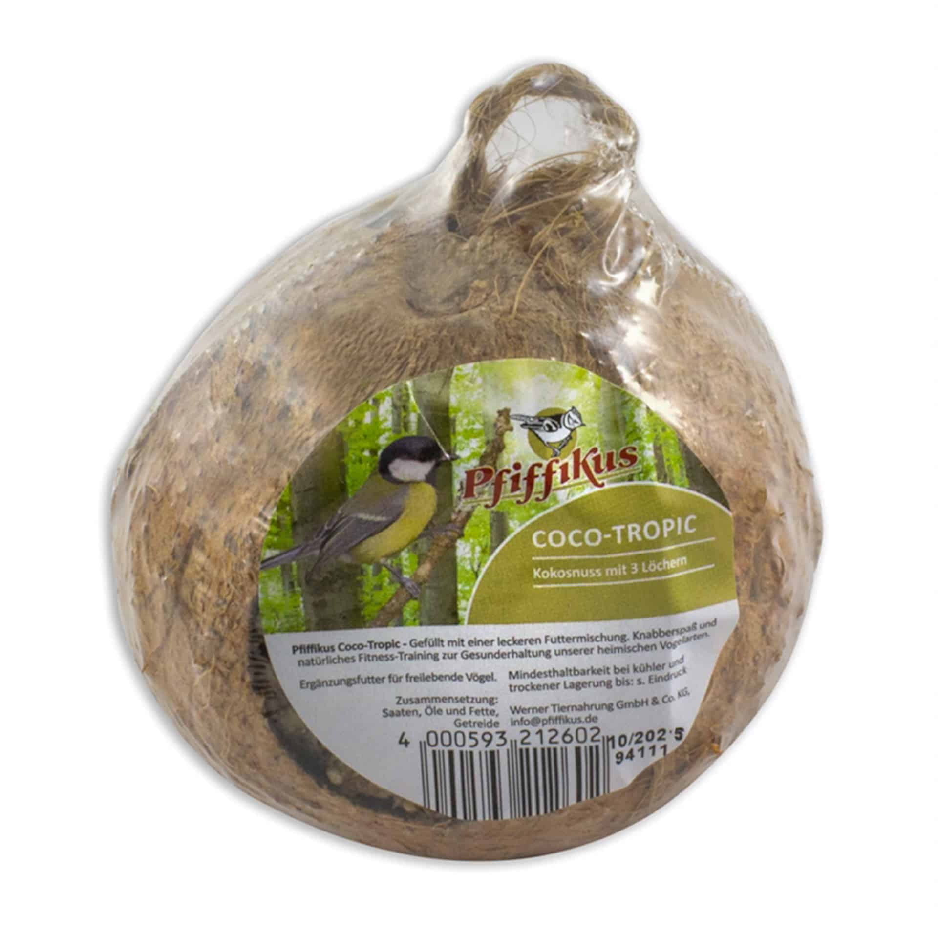 Die Pfiffikus Kokosnuss mit 3 Löchern ist mit einer energiereichen Futtermischung gefüllt und bietet Wildvögeln gleichzeitig Nahrung und Beschäftigung. Durch die drei Öffnungen gelangen die Vögel an das Futter und trainieren dabei ihre Geschicklichkeit – ganz wie in der Natur.