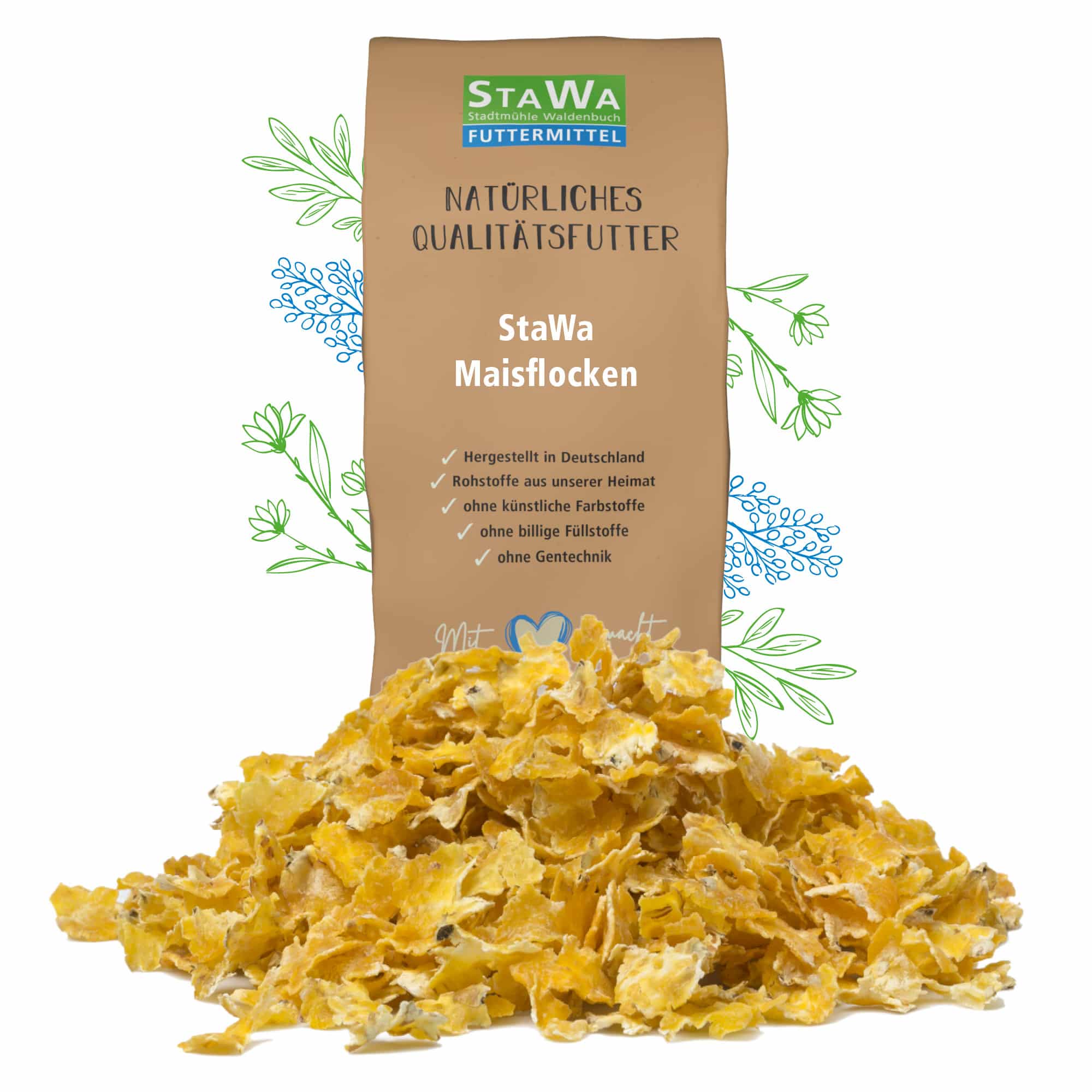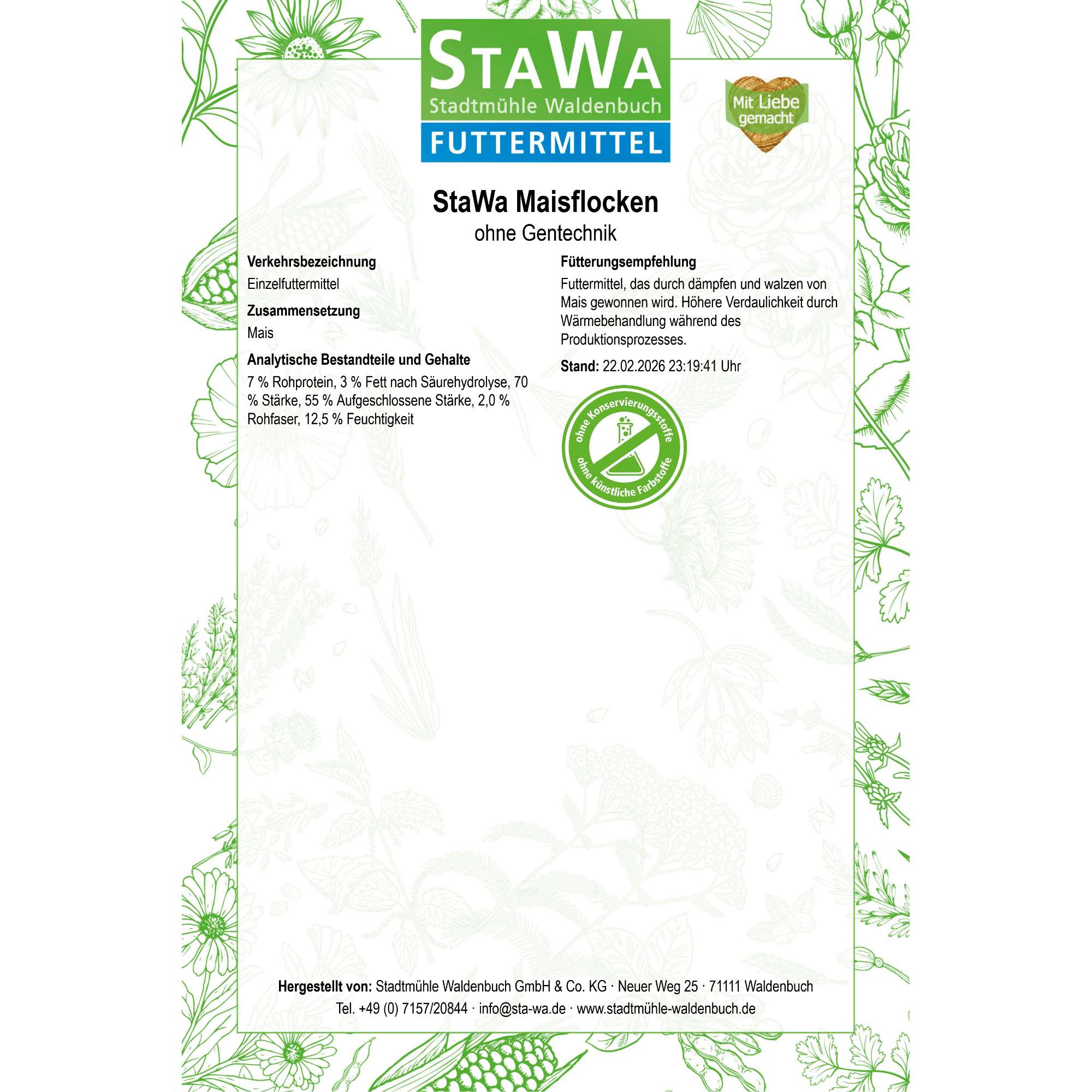 | Fütterungsempfehlung | Futtermittel, das durch dämpfen und walzen von Mais gewonnen wird. Höhere Verdaulichkeit durch Wärmebehandlung während des Produktionsprozesses. |