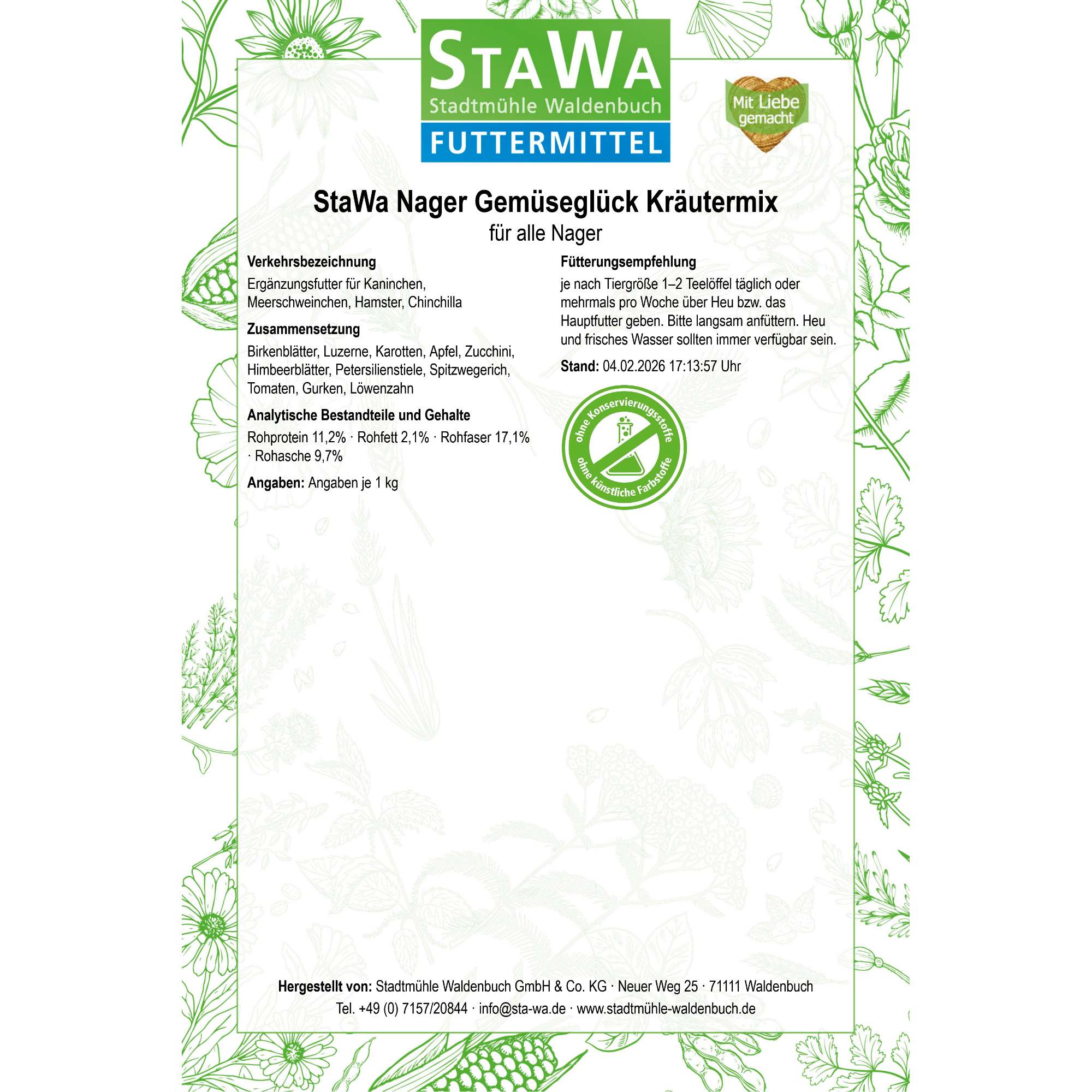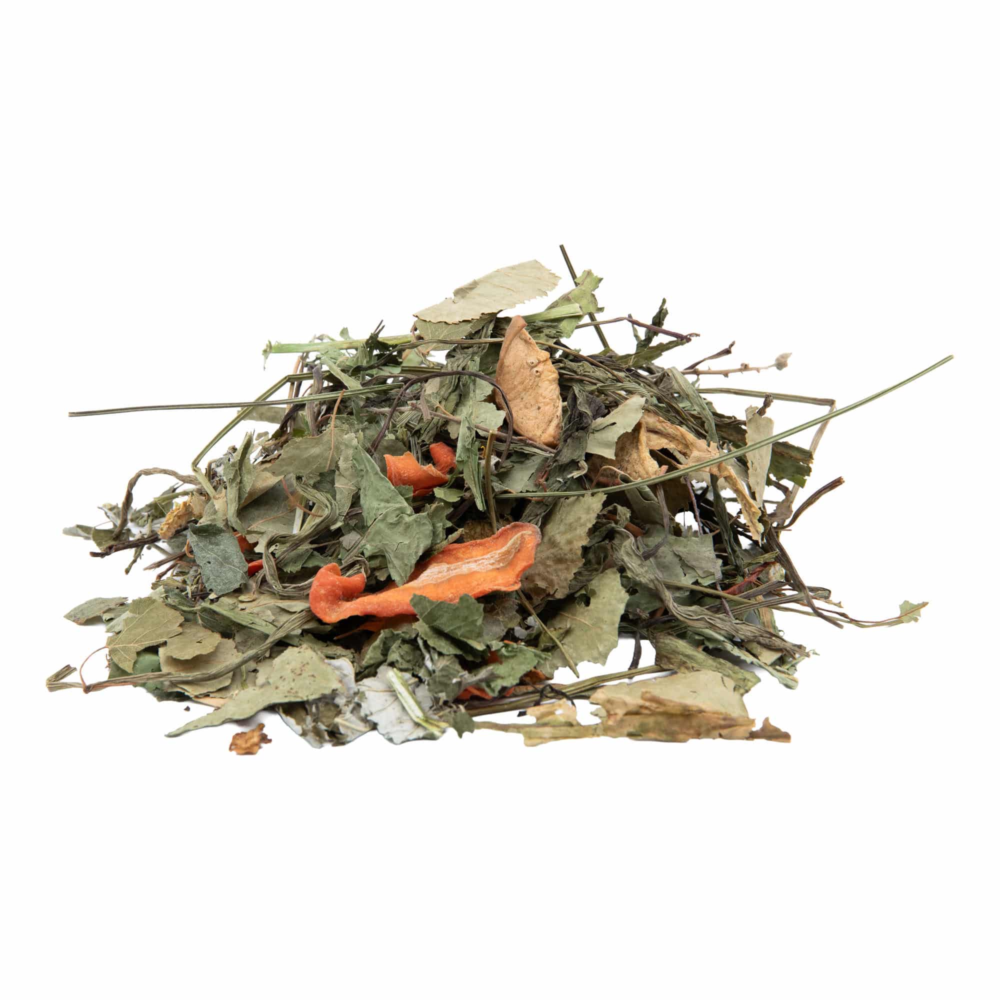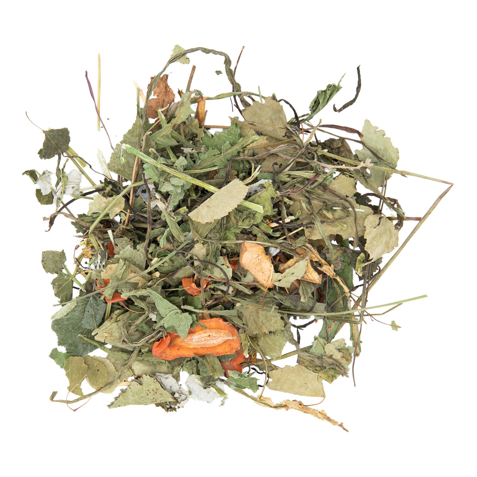 | Zusammensetzung | Birkenblätter, Luzerne, Karotten, Apfel, Zucchini, Himbeerblätter, Petersilienstiele, Spitzwegerich, Tomaten, Gurken, Löwenzahn |