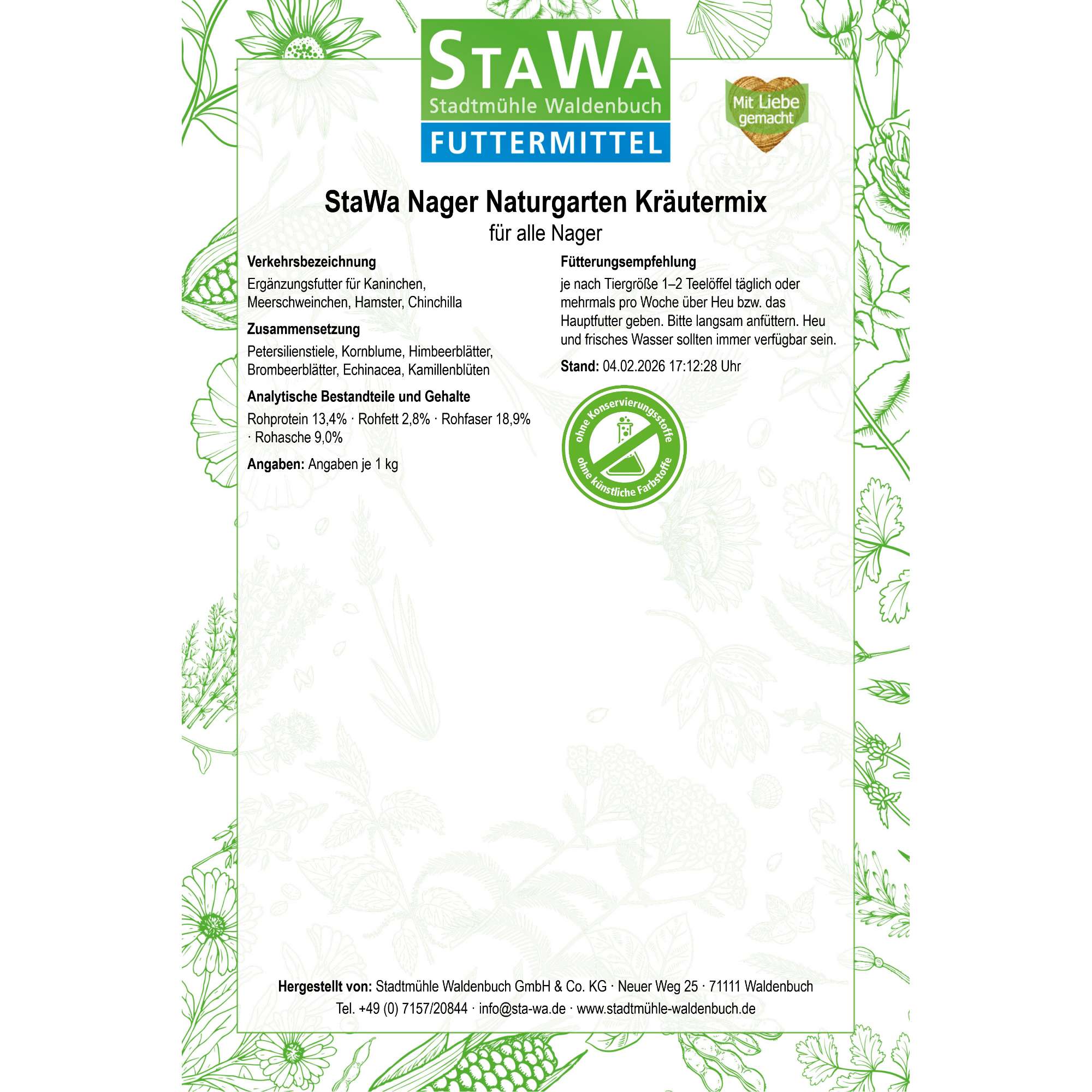 | Verkehrsbezeichnung | Ergänzungsfutter für Kaninchen, Meerschweinchen, Hamster, Chinchilla |
