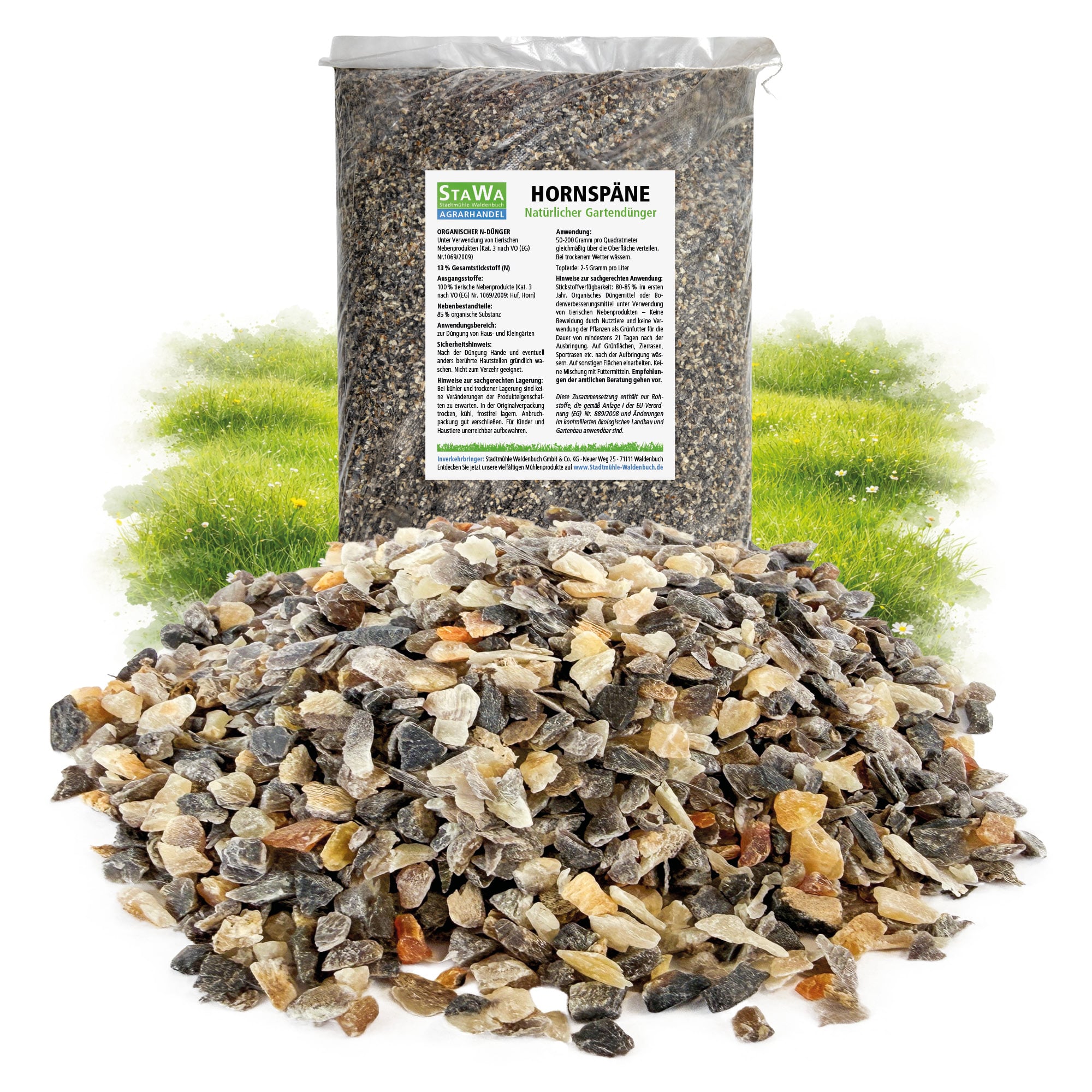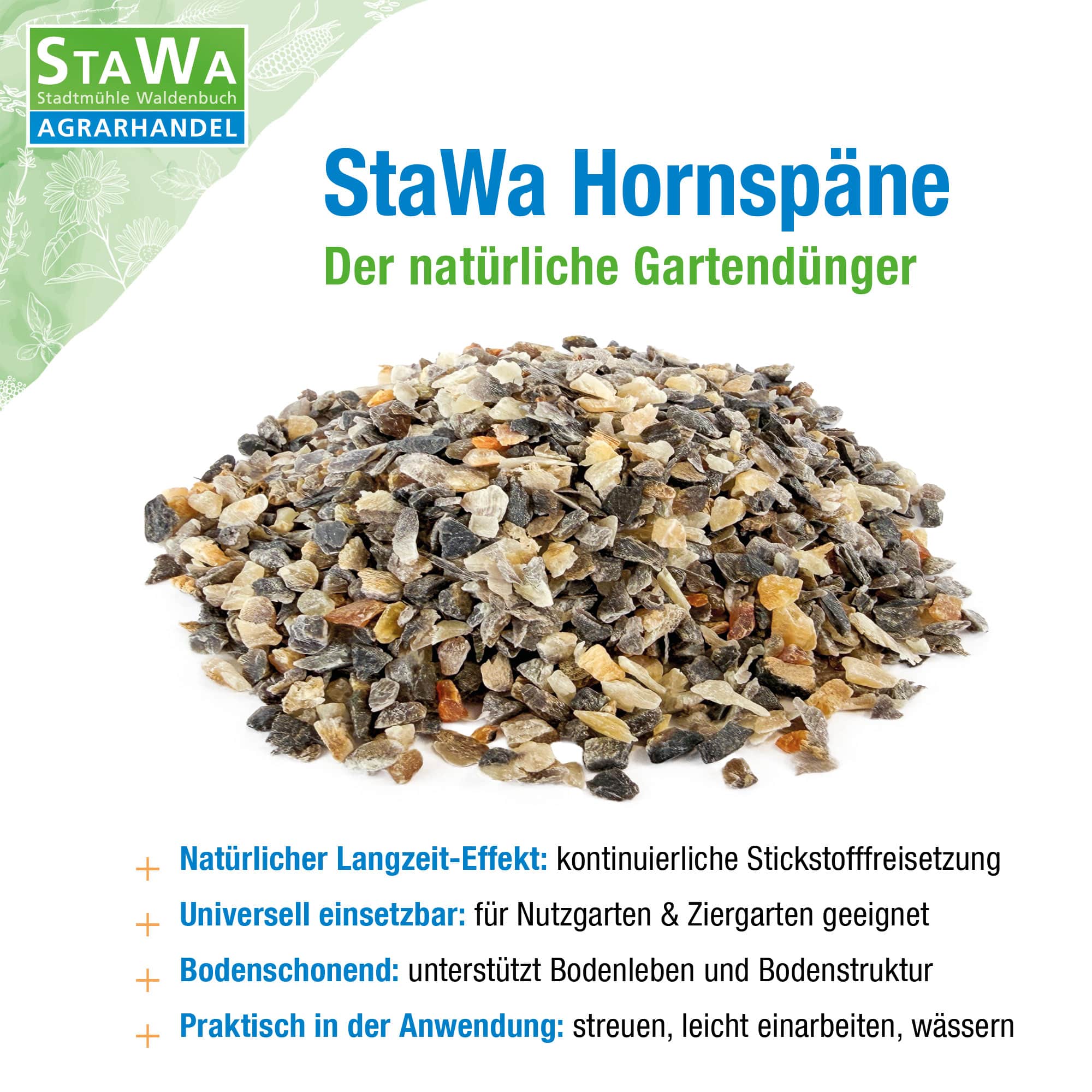 StaWa Hornspäne sind ein rein organischer Langzeitdünger für Haus- und Kleingärten. Durch die organisch gebundene Stickstoffquelle werden Ihre Pflanzen gleichmäßig und nachhaltig versorgt – ideal für Gemüsebeete, Obst, Zierpflanzen, Stauden und Rasenflächen.
