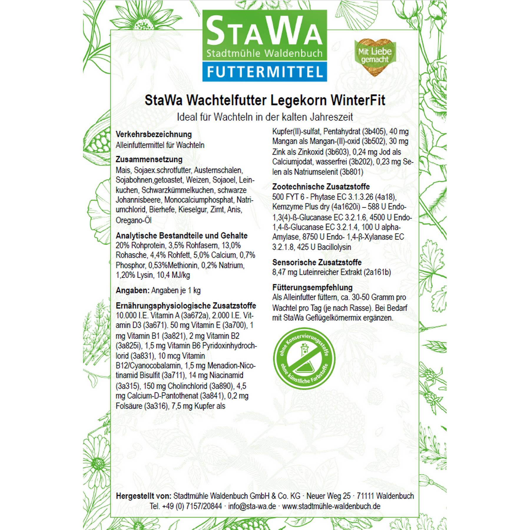 | Fütterungsempfehlung | Als Alleinfutter füttern, ca. 30-50 Gramm pro Wachtel pro Tag (je nach Rasse). Bei Bedarf mit StaWa Geflügelkörnermix ergänzen. |