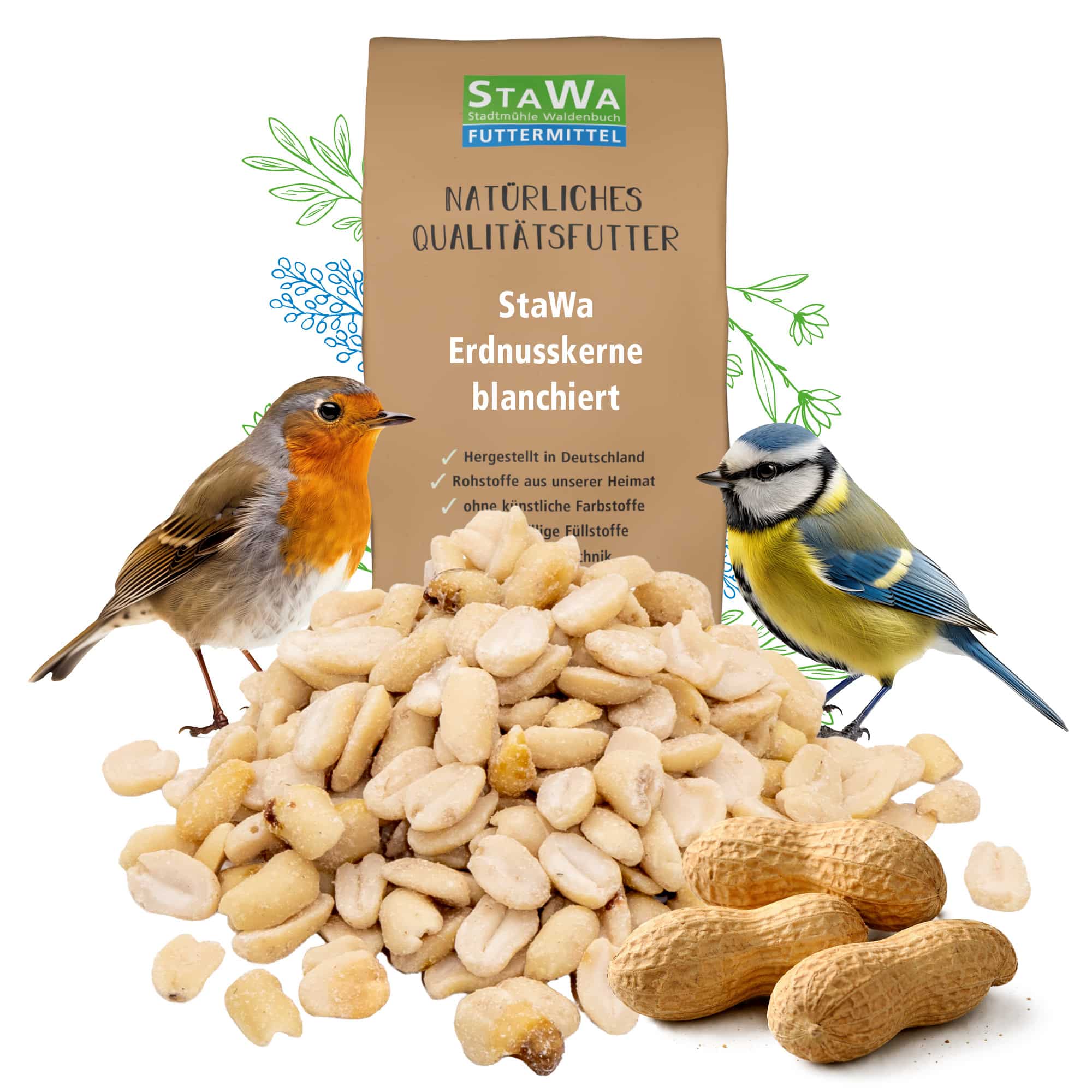 Blanchierte Erdnüsse sind das ideale Vogelfutter für alle Jahreszeiten, im Sommer und genauso im Winter.